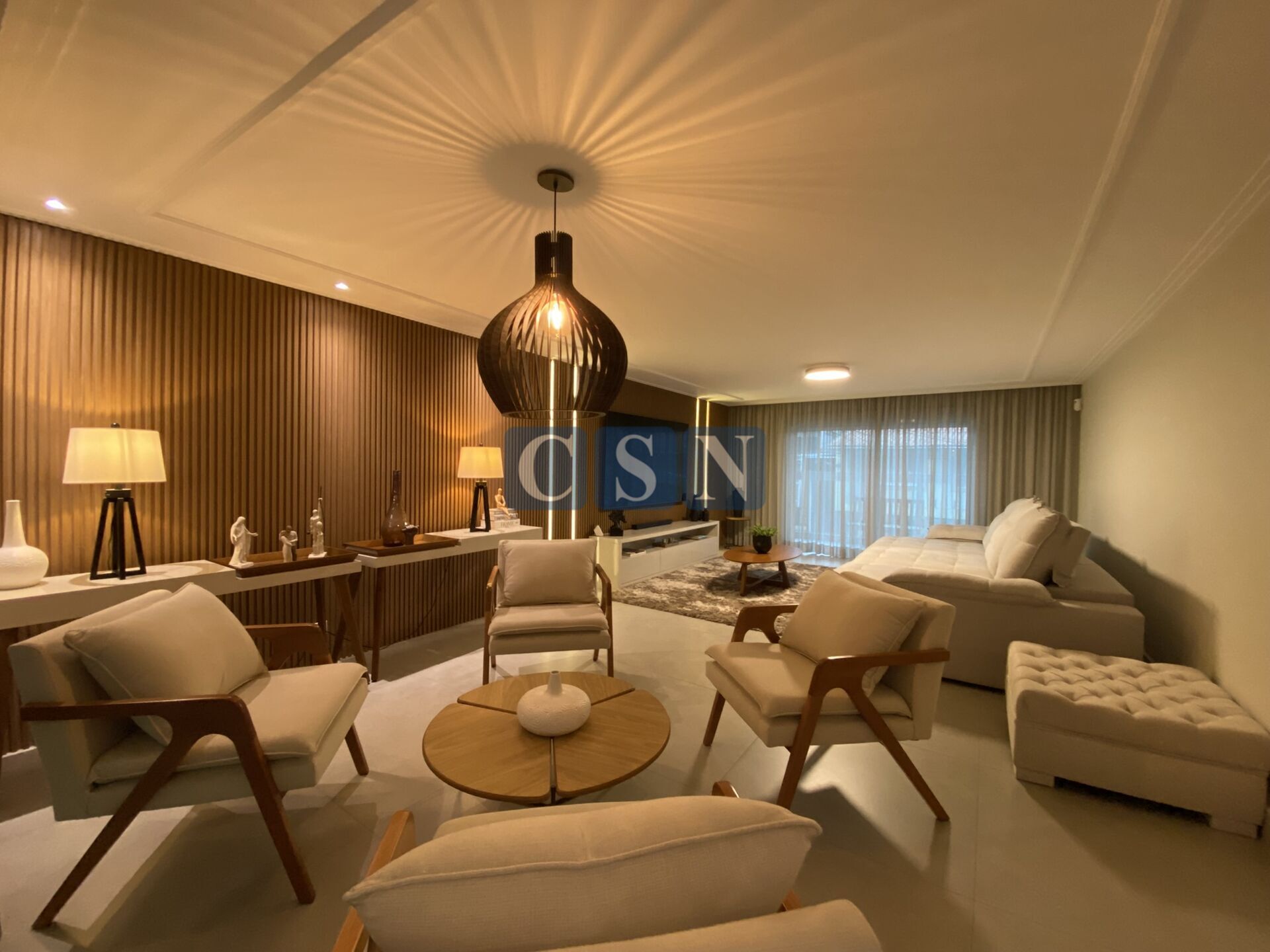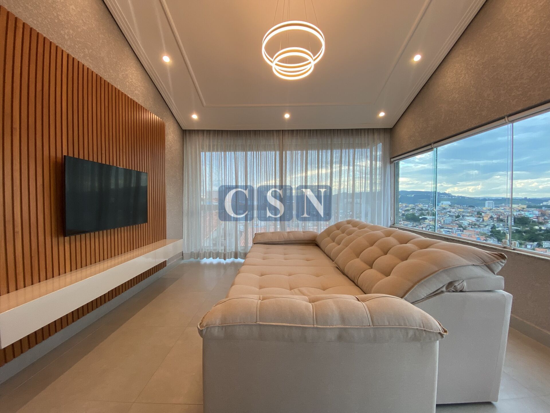 - Segundo Piso: Sala de estar/TV com painel ripado e varanda espaçosa com persiana motorizada, dois quartos amplos e um banheiro moderno.